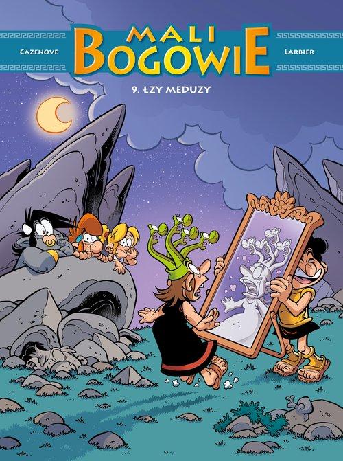 Dziewiąta część wesołych przygód niezbyt rozgarniętych kandydatów na bogów i herosów starożytnego Olimpu. Meduza jest załamana tym, że każdy człowiek, który spojrzy jej w oczy, zamienia się w kamień. W dodatku pojawia się Perseusz z zadaniem zdobycia głowy sympatycznej wężowej potworzycy. Na szczęście śmiałek nie grzeszy skutecznością. Jak zwykle rozśmieszą nas też żarłok Taurusek, nieporadny Herakles, nieznający się na żeglowaniu Odyseusz czy pomysłowy wynalazca Hefajstos. Autorami historii o psotnych istotach z mitów są scenarzysta Christophe Cazenove, znany w Polsce między innymi z bestsellerowej serii „Sisters”, oraz rysownik Philippe Larbier, który stworzył ilustracje do takich humorystycznych opowieści jak „Chats, chats, chats” czy „Nina” oraz scenariusz kryminalnego cyklu dla dzieci „Les Enigmes de Léa”.